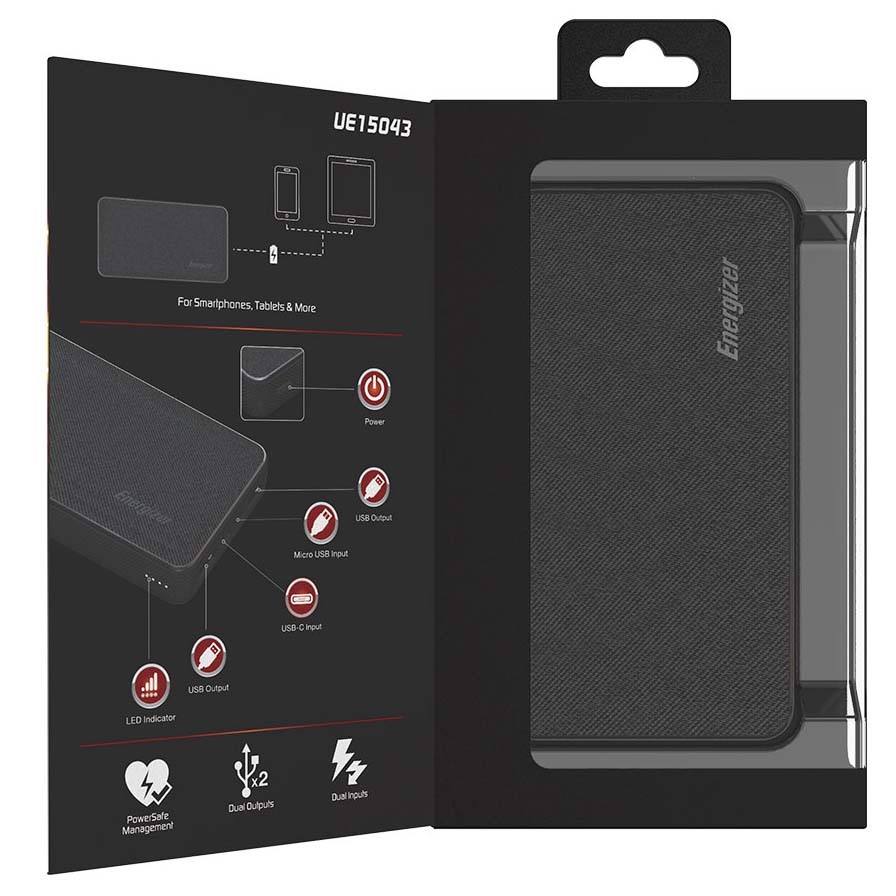 این شارژر همراه که در ابعاد 72x20x139 میلی‌متر و وزن 330 گرم ساخته شده است را می توانید به راحتی به هر جایی که می خواهید حمل کنید. پاوربانک 15000 میلی آمپر ساعت انرجایزر UE15043 به باتری لیتیوم پلیمری مجهز شده است و از ولتاژ ورودی و خروجی 5.0 ولت پشتیبانی می کند. شدت جریان ورودی 2 تا 2.1 آمپر و شدت جریان خروجی 2.1 آمپر؛ دکمه خاموش و روشن؛ بدنه پلاستیکی پوشش داده شده با پارچه؛ نشانگر LED از مشخصات دیگر این محصول می باشد.