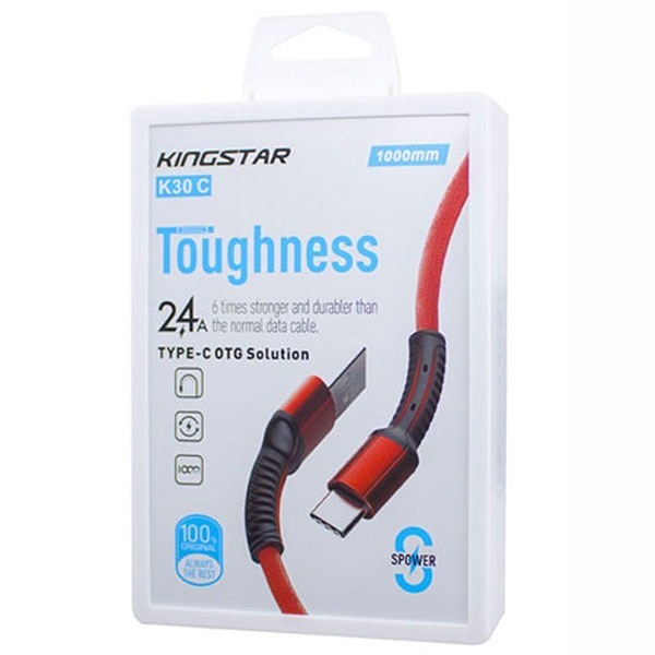 کابل شارژ 1 متری Type-C کینگ استار K30 C محصولی بی نظیر از شرکت تایوانی کینگ استار می باشد که برای شارژ کردن گوشی و انتقال داده ها با سرعتی بالا مورد استفاده قرار می گیرد. این محصول وزنی 20 گرمی دارد که یک سر آن به کانکتور Type-C و سر دیگر آن به کانکتور USB ختم می شد. در داخل کانکتور ها سوکت هایی پلاستیکی تعبیه شده اند که باعث ایجاد اتصالی امن و پایدار می شوند.