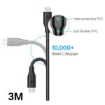 همچنین این کابل با داشتن پوشش چند لایه داخلی بسیار مقاوم بوده و تا 5000 بار در برابر خمش و پیچیدگی مقاومت میکند. همچنین جنس روکش آن PVC بوده و حدود 10 برابر بیشتر از سایر کابلها برای شما کار خواهد کرد. همچنین شرکت انکر این مدل را از نظر میزان انعطاف پذیری از تمامی جهات مورد آزمایش قرار داده است. همانطور که گفتیم جنس بدنه این محصول به گونه ای است که مانع گره خوردگی و در هم تنیدگی کابل میشود. استفاده از سیم چند تکه در طراحی کابل تبدیل USB به microUSB انکر مدل A8134 با طول 3 متر باعث شده که مقاومت داخلی آن کاهش یافته و سرعت شارژ دستگاه افزایش پیدا کند.